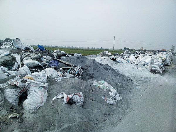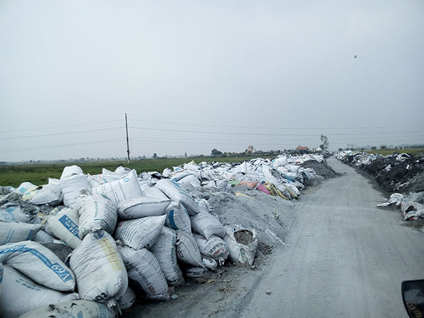 Hàng triệu bao bao tải chứa tro xỉ chất đống la liệt dọc bên đường, tràn xuống ruộng, bốc mùi hôi đến nghẹt thở.