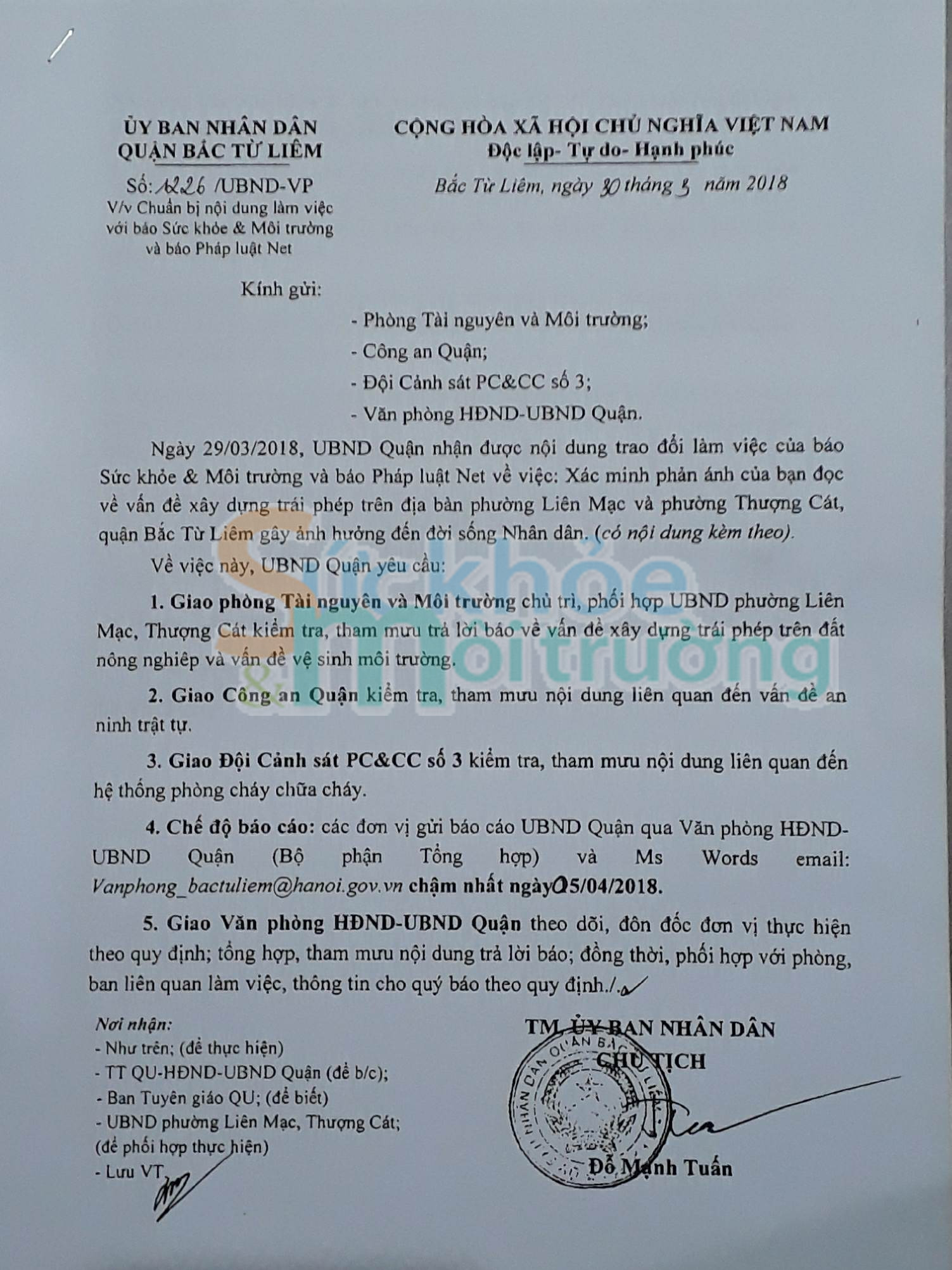 Theo đó, ngày 29/3/2018, Chủ tịch UBND quận Bắc Từ Liêm - Đỗ Mạnh Tuấn ra Văn bản số 1226. Trong đó giao cho phòng Tài nguyên & Môi trường, Công an Quận, Đội Cảnh sát PC&CC số 3 tổng hợp hồ sơ báo cáo gửi UBND quận trước ngày 05/4/2018. Và giao cho Văn phòng HĐND - UBND Quận theo dõi, đôn đốc đơn vị thực hiện theo đúng quy định. Tổng hợp, tham mưu nội dung trả lời Sức khỏe & Môi trường theo đúng quy định.