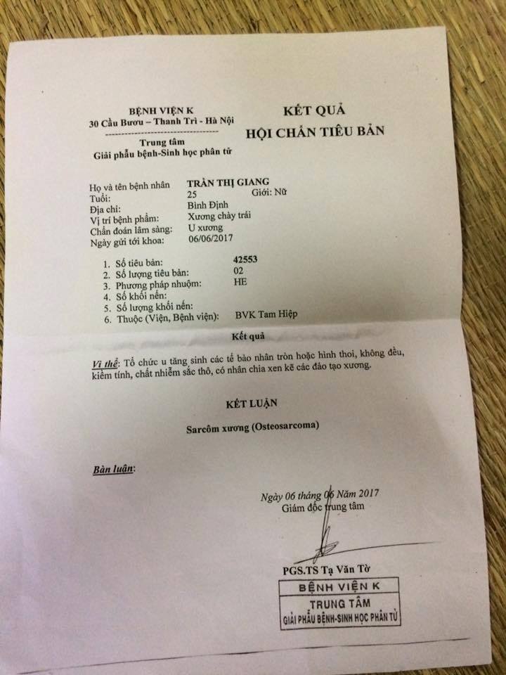 Được biết, thời điểm Giang đang mang thai thì bắt đầu xuất hiện những cơn đau ở chân trái. Có những hôm, cơn đau hành hạ khiến Giang đến mức không thể đi lại được. Chỉ đến khi sinh con xong, Giang mới có điều kiện đi khám bệnh. “Ban đầu, các bác sĩ tại bệnh viện đa khoa tỉnh Thanh Hóa chẩn đoán em bị sưng chân, tĩnh mạch giãn. Gia đình lấy thuốc về uống không khỏi, em xuống bệnh viện Việt Đức khám vào tháng 5/2017. Các bác sĩ tại Bệnh viện Việt Đức giới thiệu em sang Bệnh viện K Tân Triều làm sinh thiết. Cầm kết luận bị K xương chày khối u đã di căn sang xương mác từ bác sĩ tại Bệnh viện K Tân Triều, em suy sụp hoàn toàn” Giang buồn bã chia sẻ.