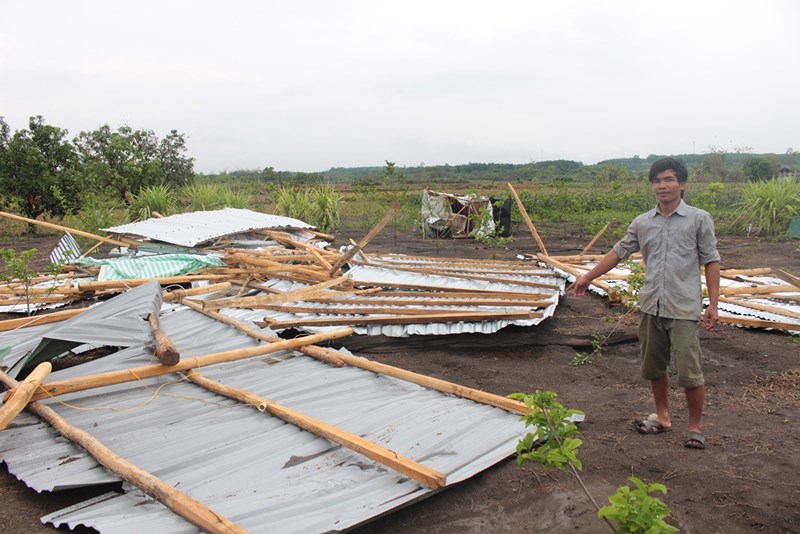 Chị Ngàn Cấm Mùi (ngụ xã Tân Tiến, là một trong những hộ ảnh hưởng nặng nề) cho biết: “Khoảng 18 giờ ngày 20/3, trận mưa lớn kéo đến bất ngờ có lốc xoáy cuồn cuộn giật toang cửa nhà, toàn bộ mái sau đó xiêu vẹo theo gió cuốn. Chủ nhà bị cánh cửa đập vào làm gãy tay phải. Chưa hết, toàn bộ vườn tiêu 3.000 trụ hơn bốn, năm tuổi nằm sạp xuống đất”.