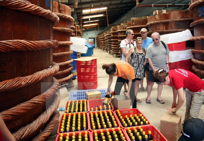 Du khách nước ngoài tham quan cơ sở sản xuất nước mắm đặc sản tại thị trấn An Thới, huyện Phú Quốc. (Ảnh: Đình Huệ/TTXVN)