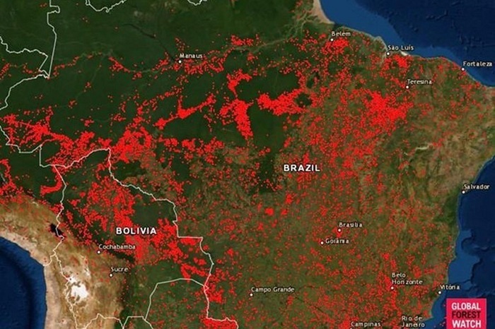 Bản đồ cho thấy vị trí của các vụ cháy rừng tại Brazil hòi tháng 8/2020