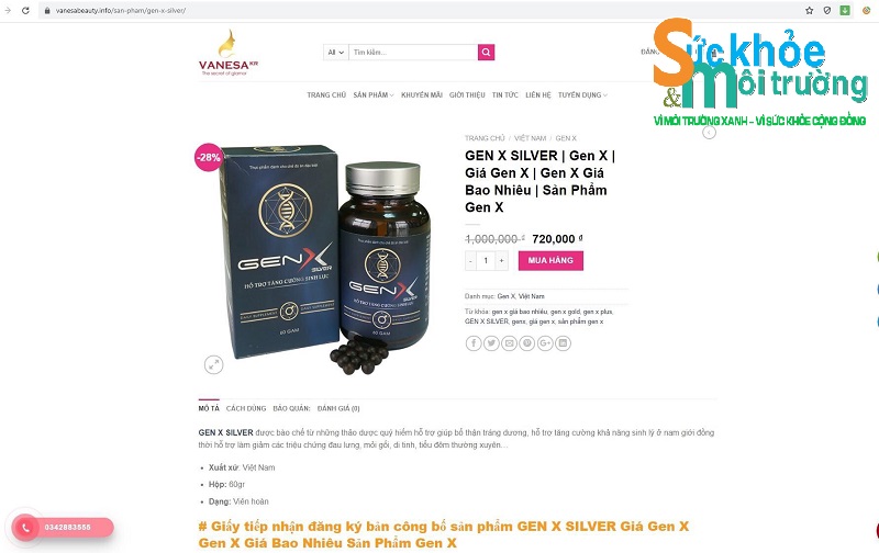 Quảng cáo sản phẩm GEN X SILVER trên trang web của Vanesa Beauty Việt Nam.