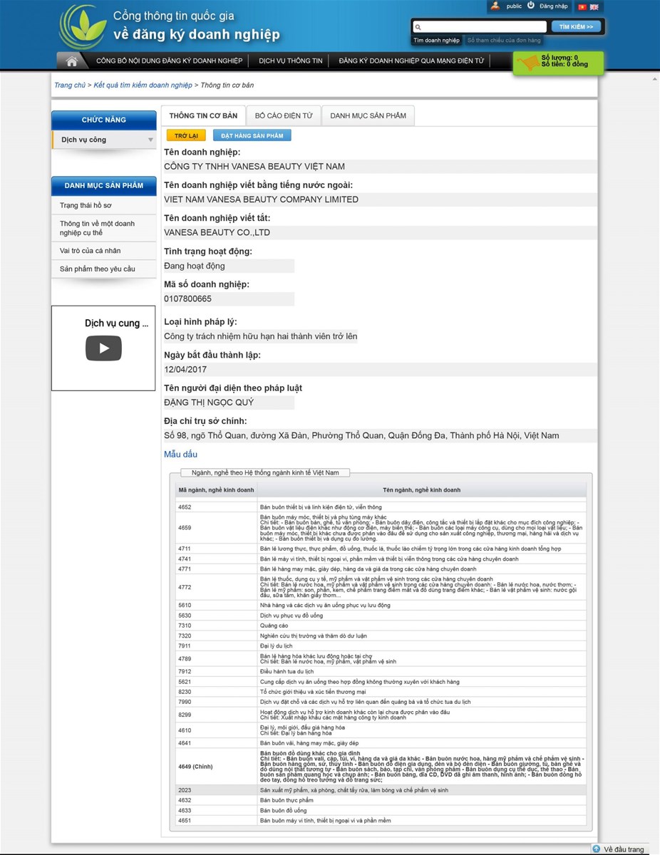 Tra cứu trên Cổng thông tin quốc gia về đăng ký doanh nghiệp (https://dichvuthongtin.dkkd.gov.vn/) chúng tôi không tìm thấy mã ngành kinh doanh nào của Vanesa Beauty Việt Nam liên quan đến thực phẩm chức năng hay thực phẩm bảo vệ sức khỏe. Ngành nghề kinh doanh chính của công ty này được thể hiện trên trang https://dichvuthongtin.dkkd.gov.vn/ là mã ngành nghề 4649 gồm: Bán buôn đồ dùng khác cho gia đình-Chi tiết: – Bán buôn vali, cặp, túi, ví, hàng da và giả da khác – Bán buôn nước hoa, hàng mỹ phẩm và chế phẩm vệ sinh – Bán buôn hàng gốm, sứ, thủy tinh – Bán buôn đồ điện gia dụng, đèn và bộ đèn điện – Bán buôn giường, tủ, bàn ghế và đồ dùng nội thất tương tự – Bán buôn sách, báo, tạp chí, văn phòng phẩm – Bán buôn dụng cụ thể dục, thể thao – Bán buôn sản phẩm quang học và chụp ảnh; – Bán buôn băng, đĩa CD, DVD đã ghi âm thanh, hình ảnh; – Bán buôn đồng hồ đeo tay, đồng hồ treo tường và đồ trang sức.