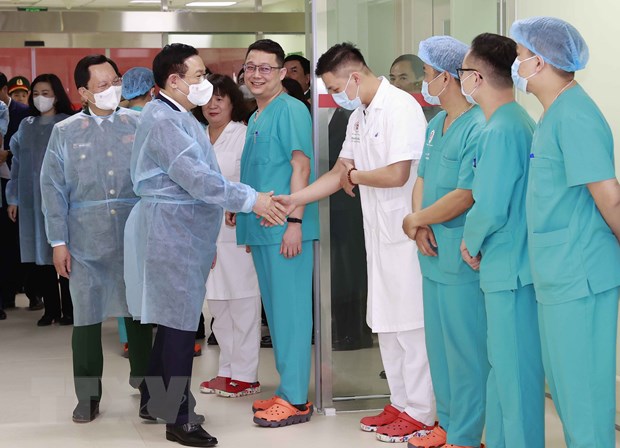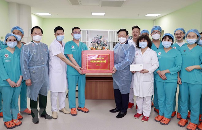 Chủ tịch Quốc hội Vương Đình Huệ với các y, bác sỹ Khoa hồi sức ngoại khoa và ghép tạng, Bệnh viện Trung ương Quân đội 108. (Ảnh: Doãn Tấn/TTXVN)
