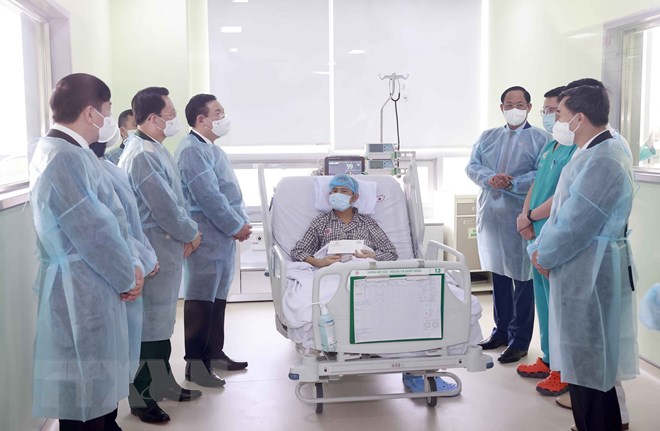 Chủ tịch Quốc hội Vương Đình Huệ thăm, tặng quà bệnh nhân tại Khoa hồi sức ngoại khoa và ghép tạng, Bệnh viện Trung ương Quân đội 108. (Ảnh: Doãn Tấn/TTXVN)