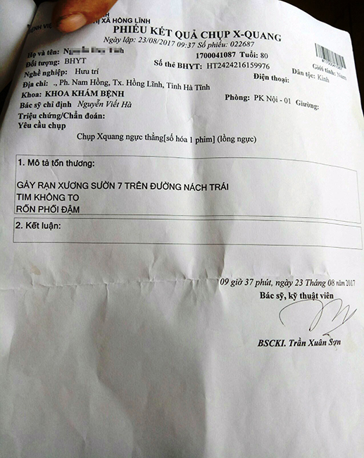 Tại đây, cụ ông T. được bác sĩ chỉ định đi chụp X-quang. Kết quả chụp X-quang mô tả tổn thương là “gãy rạn xương sườn 7 trên đường nách trái, tim không to, rốn phổi đậm”.