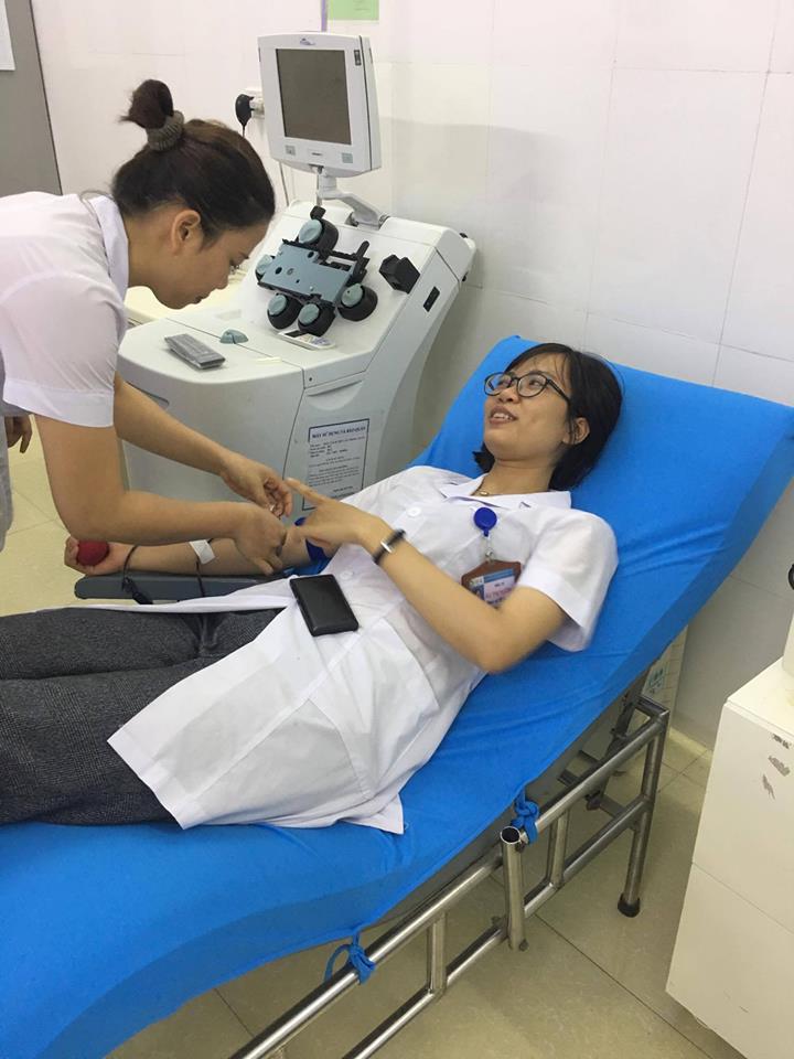 Một điều dưỡng Bệnh viện Sản – Nhi hiến máu cứu phục vụ cho quá trình cấp cứu sản phụ Mến. Ảnh Bệnh viện cung cấp.