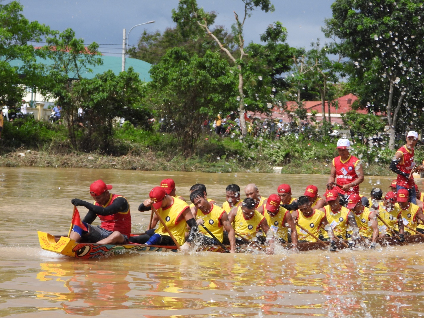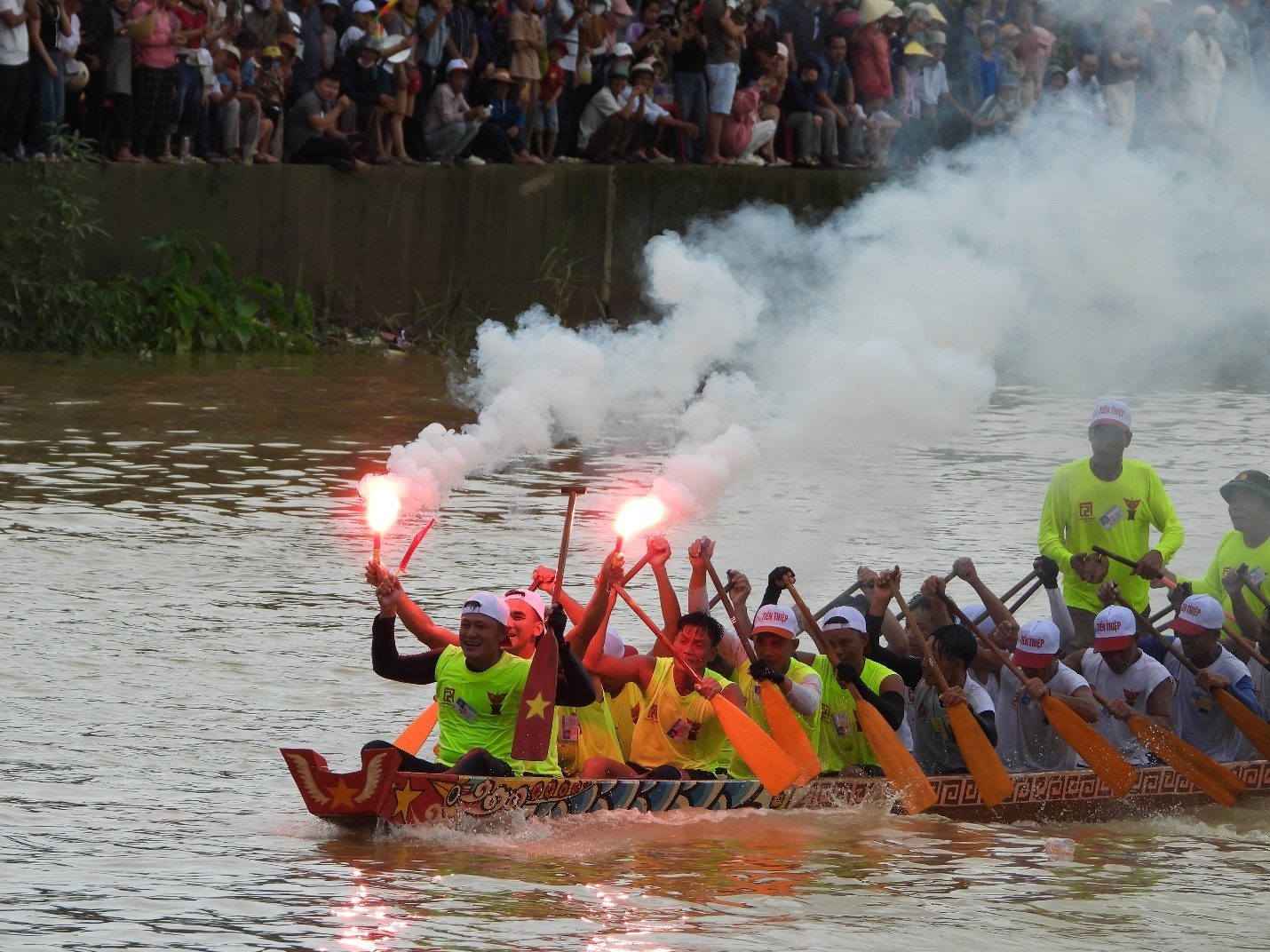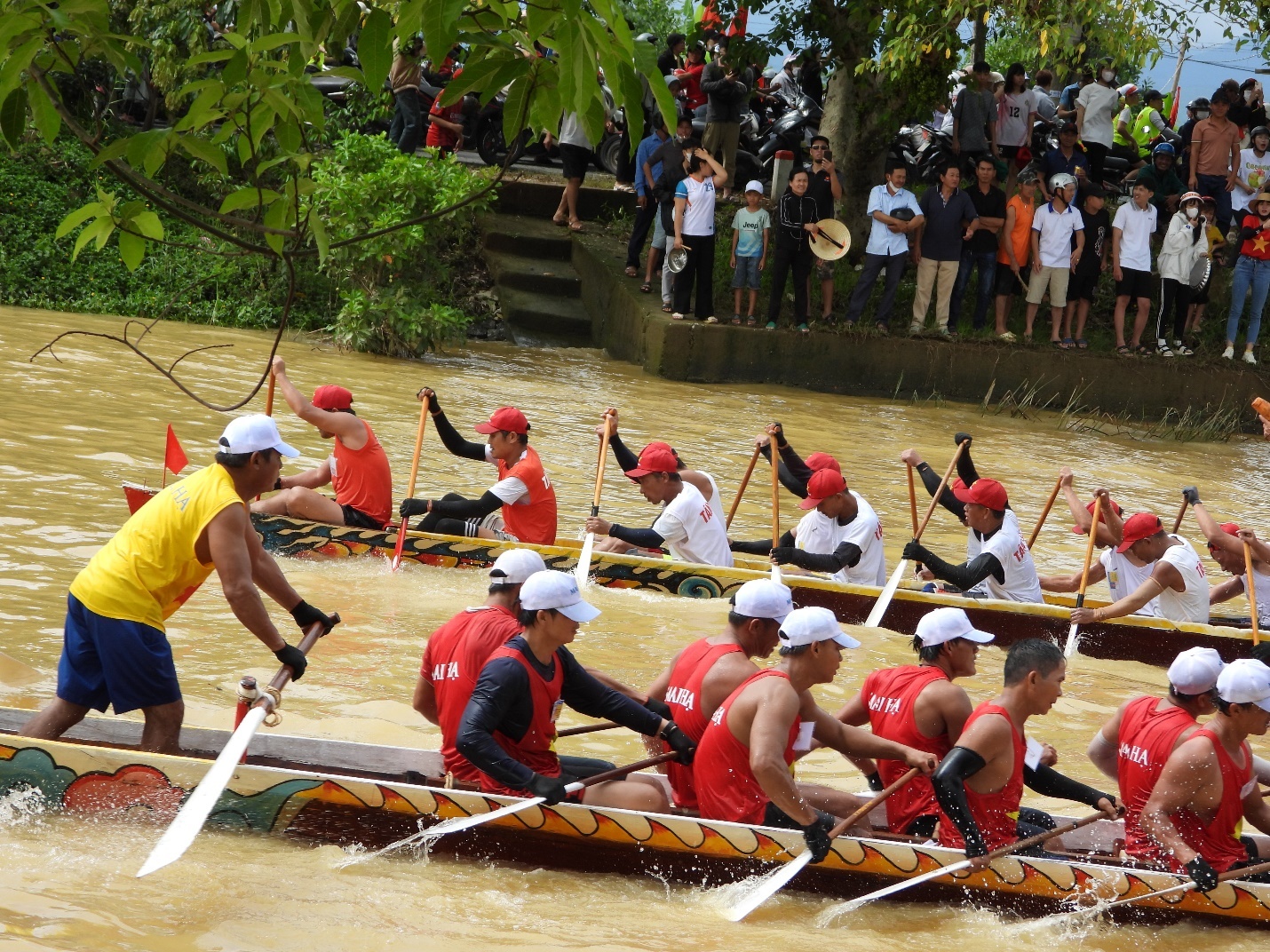 | Các thuyền bơi nam cạnh tranh quyết liệt từ lúc buông phao cho đến khi cán đích |