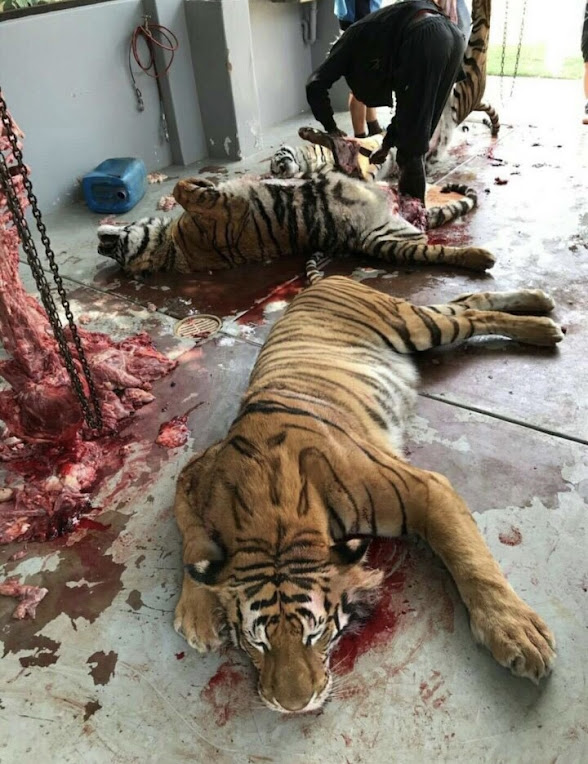 Tại vùng Tam Giác Vàng, chúng tôi không chỉ chứng kiến họ đưa thịt hổ, tay gấu vào thực đơn trong nhà hàng, ghi hẳn tên tiếng Anh “Tiger Meat” (thịt hổ, xem ảnh) trong cuốn thực đơn ép plastic, in sang trọng; mà còn tận thấy cảnh nuôi hổ lấy thịt, lấy xương, phục vụ thú chơi không kém phần nhẫn tâm của người ta. Đó là khu kinh tế mở trên lãnh thổ Lào, ở vùng giáp ranh 3 quốc gia: Lào, Thái, Myanmar. Họ nuôi cả đàn gấu, hổ, khỉ, các con vật gầy ốm, thương tật, rên xiết. Vừa phục vụ tham quan, vừa phục vụ giết mổ.
