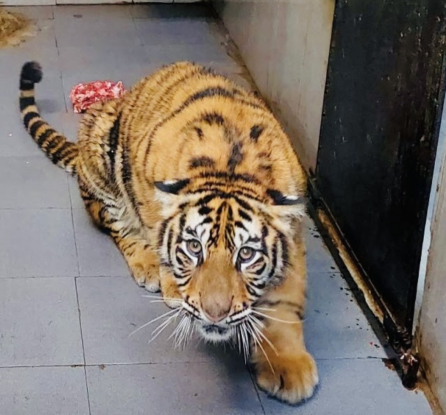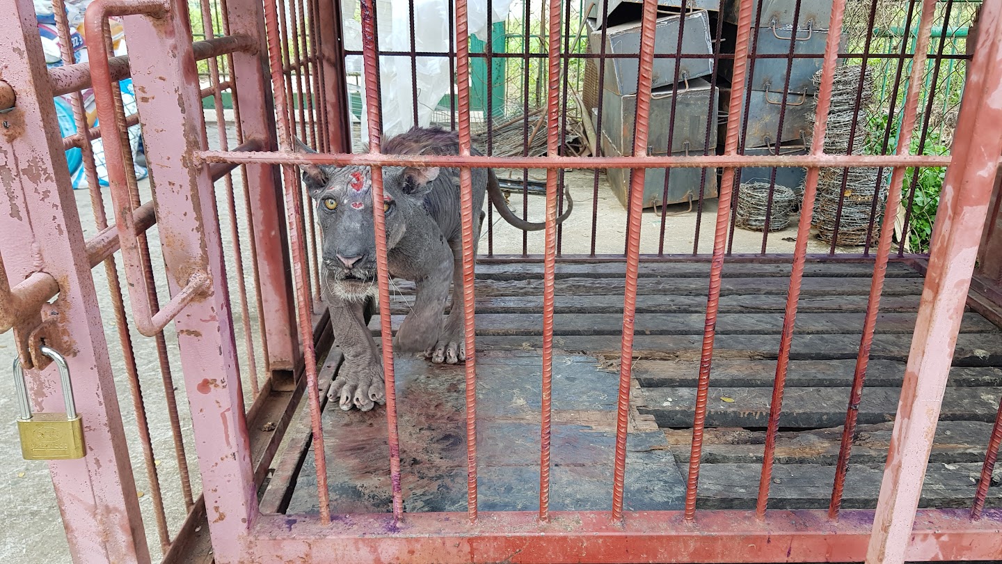 Cá thể hổ bị nuôi nhốt ở Tam Giác Vàng, trên lãnh thổ Lào, nó bệnh tật và máu me, trụi lông, rất thê thảm.