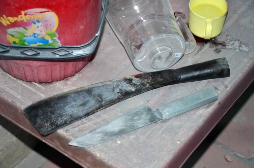 Tìm cách phá cửa xông vào nhà Tâm, trên tay đối tượng lúc này cầm 2 cây dao chém đã đâm lại lực lượng thi hành công vụ.
