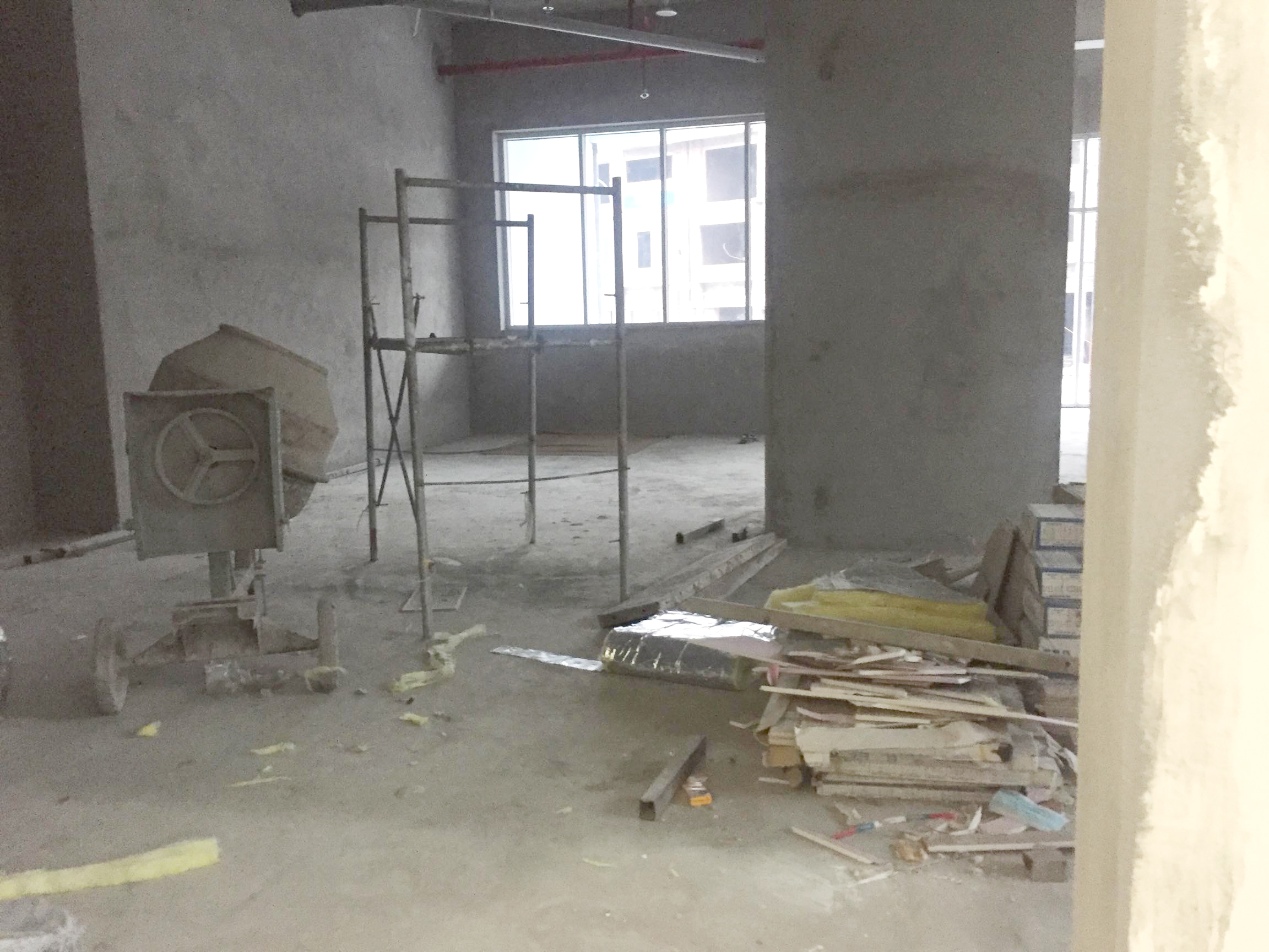 Lối vào và tầng 1 của tòa nhà vật liệu, dàn giáo vẫn ngổn ngang.