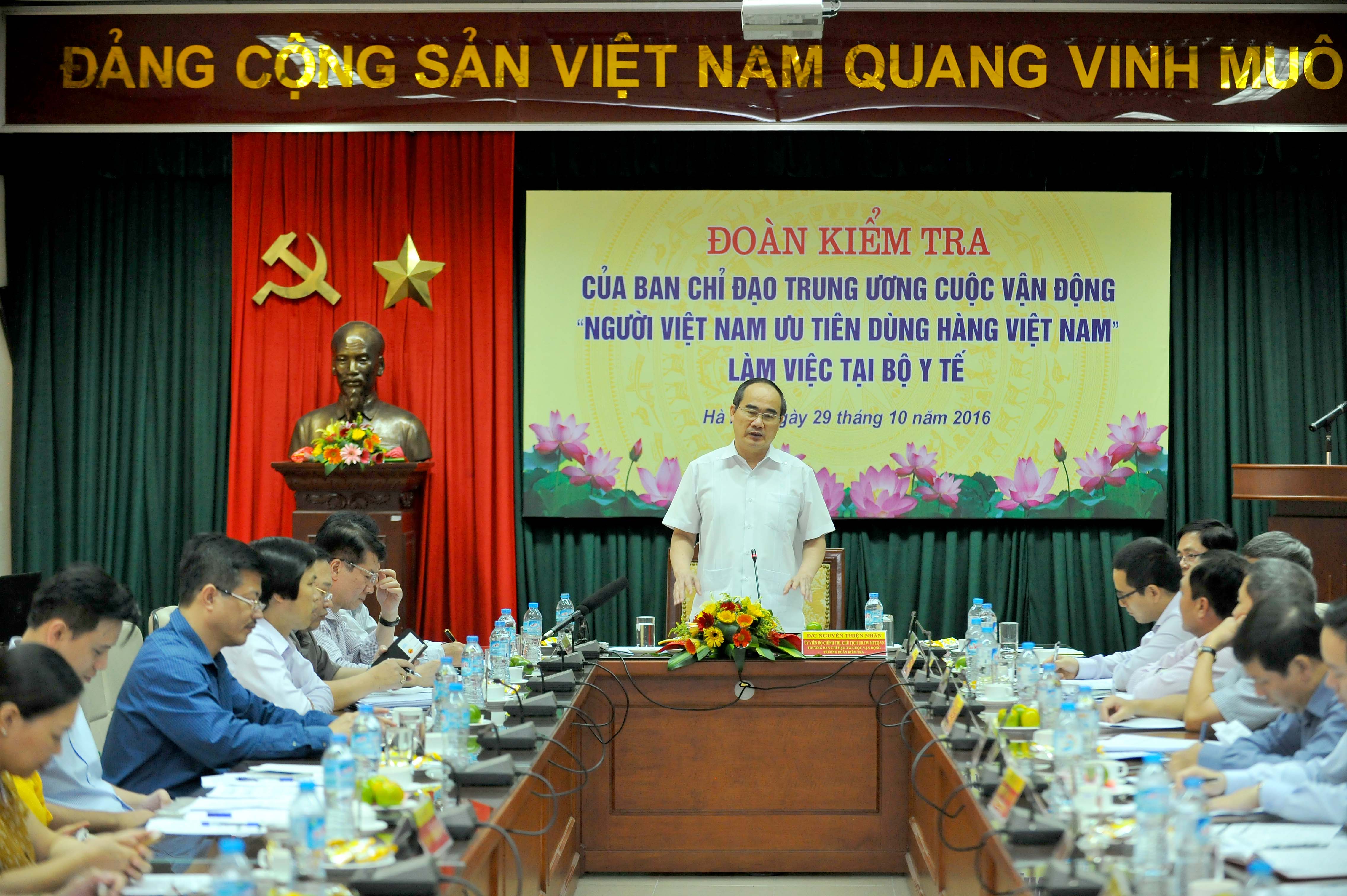 Phát biểu tại buổi làm việc, Chủ tịch Ủy ban Trung ương MTTQ Việt Nam Nguyễn Thiện Nhân hoan nghênh việc Bộ Y tế đã có chủ trương sớm, đồng bộ và quyết liệt trong việc hưởng ứng Cuộc vận động “Người Việt Nam ưu tiên dùng hàng Việt Nam” thông qua việc hiện thực hóa “Người Việt Nam dùng thuốc Việt Nam” và khẳng định “đây là một trách nhiệm chính trị với đất nước”.