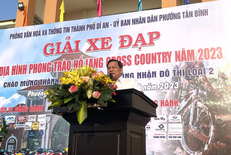 Phát biểu chào mừng các vận động viên tham gia giải Ông Phạm Văn Bảy, Phó Chủ tịch UBND TP. Dĩ An hân hoan chào đón các vận động viên đến tham gia giải từ mọi miền đất nước và một số vận động viên nước ngoài, ông Bảy mong muốn rằng các vận động viên đoàn kết giao lưu gắn bó chia sẻ kinh nghiệm trong phòng trào thể dục thể thao nói chung và xe đạp nói riêng, Phó Chủ tịch UBND TP. Dĩ An Phạm Văn Bảy đề nghị phường Tân Bình tạo mọi điều kiện tốt nhất cho các vận động viên tham gia giải đạt thành tích cao nhất, ông cũng không quên cảm ơn các nhà tài trợ luôn đồng hành góp phần thành công của giải.