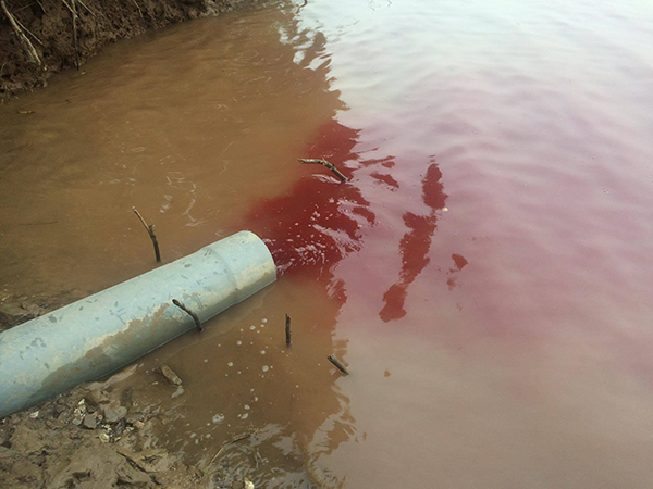 Đường vào khu vực xả thải phải đi qua một số diện tích đất hoa màu của người dân, nguồn nước thải của Công ty tuồn ra một đoạn mương được xây dựng khá vững chắc chạy thẳng ra dòng sông luộc. Nước thải có màu đỏ máu được tuồn ra sông bốc mùi tanh nồng nặc, kèm theo đó là ruổi nhặng vây quanh.