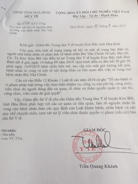 Sau khi nắm bắt thông tin phản ánh trên mạng xã hội và cơ quan Báo chí phản ánh, ngày 19/9 Sở Y tế tỉnh Hòa Bình có Công văn số 1810/SYT-TTra, về việc xem xét làm rõ nguyên nhân tử vong của bệnh nhân Bùi Văn Chính.