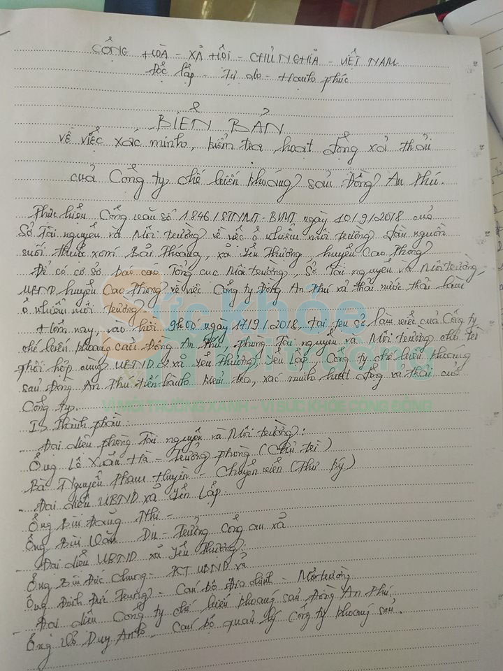 Cũng theo ông Chung, sau khi tiếp nhận ý kiến phản ánh của cử tri, ngày 17/9/2018, Phòng TNMT huyện Cao Phong, phối hợp cùng với UBND 2 xã Yên Thượng và Yên Lập, tiến hành kiểm tra, xác minh hoạt động xả thải của Công ty đồng An Phú.