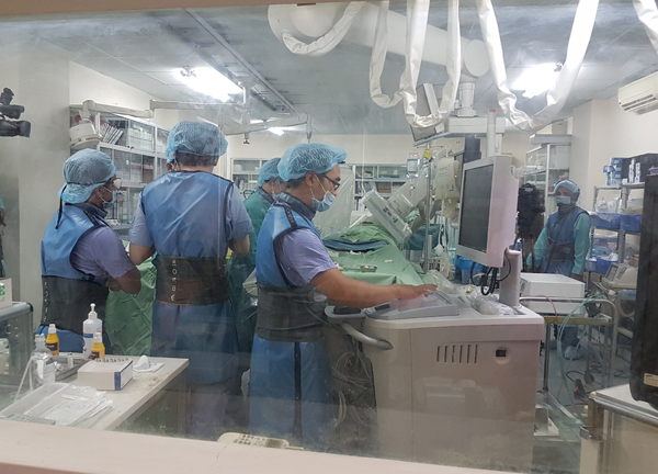 Các chuyên gia đang thực hiện ca can thiệp tim mạch tại BVĐK tỉnh Khánh Hòa.
