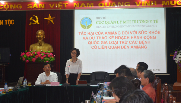 Ông Trần Anh Thành – Cục Quản lý Môi trường Y tế (Bộ Y tế) đã nêu những tác hại của amiăng đối với sức khỏe, các bệnh liên quan đến amiăng như ung thư trung biểu mô (màng phổi, màng bụng, màng tim), ung thư phổi, ung thư thực quản, buồng trứng …và chi phi cho một ca phẫu thuật ung thư có thể lên tới gần 300 triệu đồng. Đồng thời ông Thành cũng trình bày dự thảo Kế hoạch hành động quốc gia loại trừ các bệnh liên quan đến amiăng, trong đó chỉ ra các mục tiêu, chỉ tiêu cụ thể, kế hoạch hoạt động, các nhóm giải pháp, tổ chức thực hiện và nguồn kinh phí.