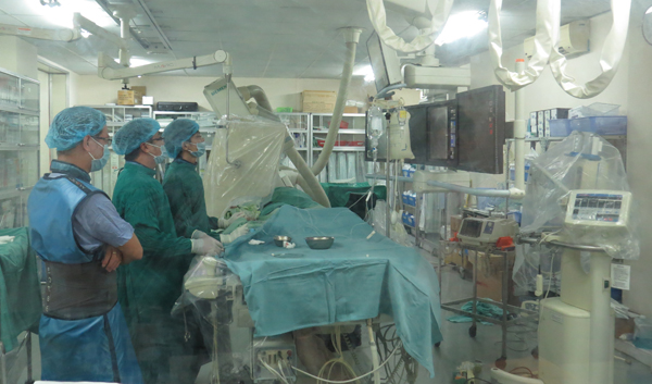 Ê-kíp bác sĩ của BVĐK tỉnh Khánh Hòa thực hiện can thiệp tim mạch cho bệnh nhân.