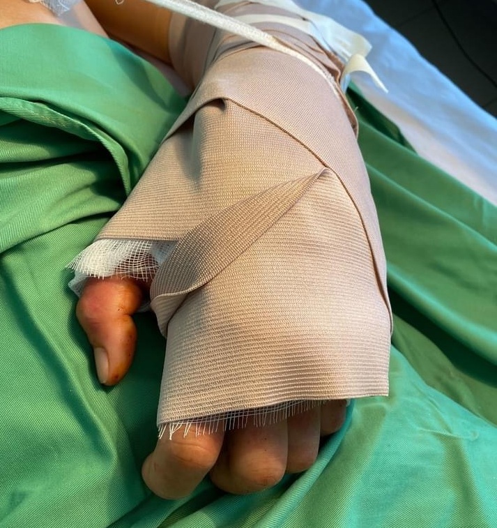 Khi tiếp nhận bệnh nhân, BV vừa tiến hành sàng lọc test nhanh kháng nguyên Covid-19 cho bệnh nhân và 1 người nhà đi theo. Đồng thời vừa cấp cứu hồi sức và thực hiện các cận lâm sàng tiền phẫu đầy đủ. Sau đó bệnh nhân được chuyển lên Phòng Mổ khoa Phẫu thuật - Gây mê hồi sức để xúc tiến vi phẫu nối chi thể. Ca vi phẫu thuật được thực hiện ngay trong đêm 19/7 và kéo dài đến 7g 00 sáng 20/7/2021. Ê-kíp thực hiện phẫu thuật gồm có: Phẫu thuật viên (PTV) chính bác sỹ (BS) CK1.Trần Ngọc Khanh, Ths. BS Lê Minh Hoan và Ths. BS Lê Thanh Minh đã tiến hành kết hợp xương bằng 2 đinh Kirschner, khâu nối vi phẫu bó mạch trụ quay và thần kinh giữa, khâu nối các tĩnh mạch, lấy tĩnh mạch hiển chân phải ghép 4 tĩnh mạch mu tay và nối trực tiếp một tĩnh mạch. Kiểm tra máu hồi lưu tốt, bàn tay trái được tưới máu tốt. Tiếp tục khâu nối các gân trừ gân gấp chung nông các ngón, gân gan tay dài, gân duỗi ngón cái dài và gân duỗi cổ tay trụ. Sau phẫu thuật bàn tay của bệnh nhân được sưởi ấm, các ngón tay hồng trở lại và đã mấp máy được các ngón tay.