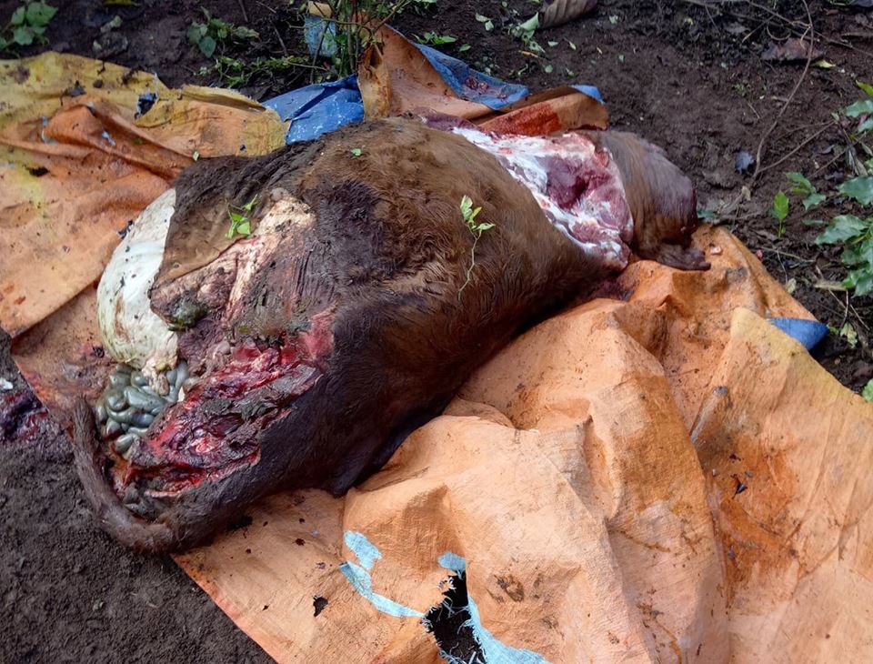 Con bò bị khoét 4 đùi, còn trơ lại phần thân nằm cách chuồng khoảng 10m.