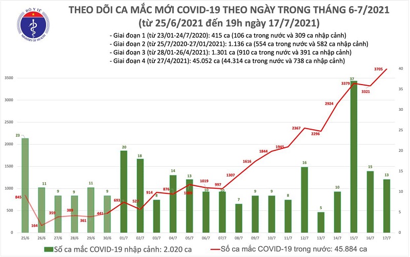 Biểu đồ diễn biến dịch Covid-19 tính đến 19h ngày 17/7, theo số liệu từ Bộ Y tế