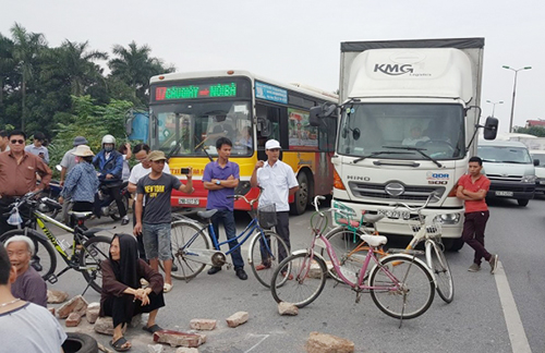 Người dân xã Nam Đồng (huyện Đông Anh, Hà Nội) đã mang các vật dụng chặn ngang đường Quốc lộ hướng trung tâm Hà Nội – Nội Bài, khiến giao thông tắc hàng giờ.