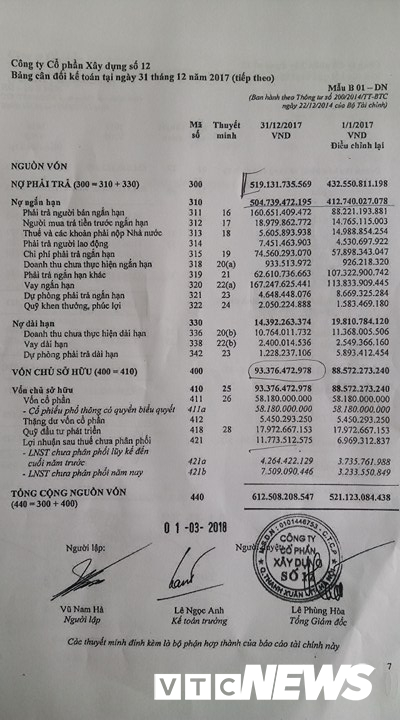 Kết thúc năm tài chính 2017, Vinaconex 12 ghi nhận khoản nợ phải trả lên tới hơn 519,1 tỷ đồng trong khi vốn chủ sở hữu chỉ hơn 93,3 tỷ đồng.