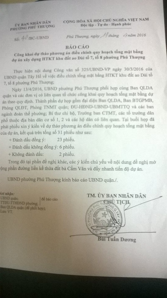Ông Quảng còn cho biết thêm: “Việc cấp giấy chứng nhận quyền sử dụng đất cho các hộ nhà bà Cẩm Vân và ông Đông Văn Thành là cần đề nghị xem xét, việc cấp có vấn đề nhưng Quận không phải là người cấp mà là Sở cấp nên quận cũng không dám có ý kiến tham gia. Theo bản đồ năm 1994 của UBND phường Phú Thượng thì đây không phải là đất cấp được giấy chứng nhận quyền sử dung đất”.