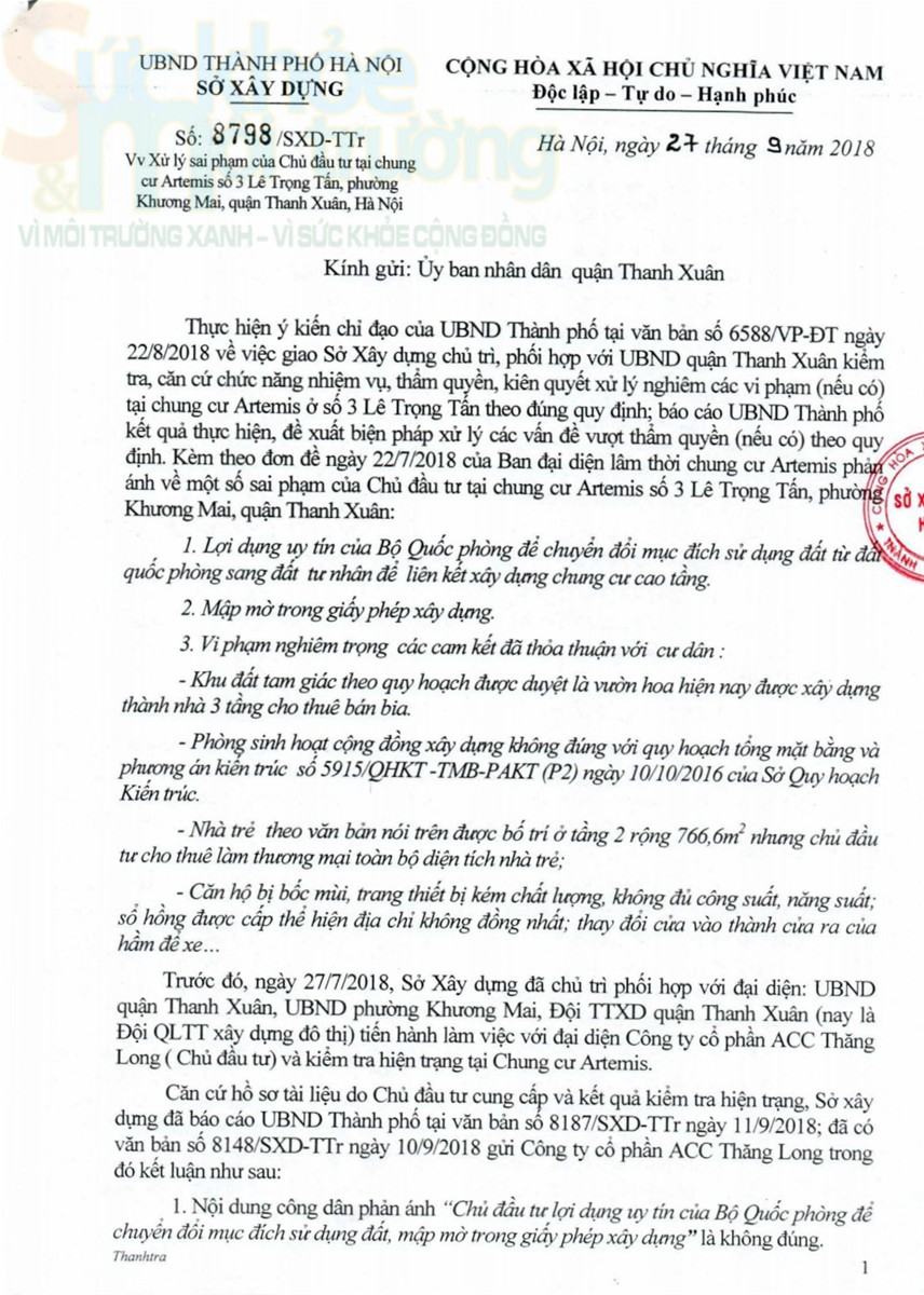 Việc làm trên của chủ đầu tư khiến Sở Xây dựng Hà Nội không khỏi bức xúc. Chính vì lẽ đó, ngày 27/9/2018 Sở Xây dựng Hà Nội có Văn bản số 8798/SXD-TTr gửi UBND quận Thanh Xuân phối hợp xử lý nghiêm và dứt điểm những tồn tại trên. Theo đó, Sở Xây dựng Hà Nội đề nghị UBND quận Thanh Xuân đôn đốc chủ đầu tư chung cư Artemis là Công ty cổ phần ACC – Thăng Long nghiêm túc thực hiện các yêu cầu của Sở tại Văn bản số 8148/SXD-TTr, trong đó yêu cầu: Thứ nhất, tạm dừng việc kinh doanh dịch vụ tại tầng 2 và tầng 3 của khối nhà kỹ thuật tại khu đất số 3 cho đến khi được cơ quan có thẩm quyền chấp thuận về việc điều chỉnh. Tiếp đó, phá dỡ vách ngăn phòng sinh hoạt cộng đồng tại trục 9 tầng 8 bản vẽ KT11 của Hồ sơ thiết kế phương án kiến trúc đã được Sở Quy hoạch kiến trúc chấp thuận. Nếu chủ đầu tư không chấp hành, đề nghị UBND quận Thanh Xuân căn cứ thẩm quyền được thành phố giao, tiến hành lập hồ sơ, xử lý vi phạm theo quy định. Nhưng đến thời điểm này vẫn chưa thấy bất cứ động thái nào từ phía UBND quận yêu cầu chủ đầu tư phải nghiêm chỉnh yêu cầu của Sở Xây dựng do ông Trần Việt Trung – Phó Giám đốc Sở ký và gửi đến quận vào ngày 27/9/2018 là tạm dừng hoạt động diện tích sử dụng sai công năng.