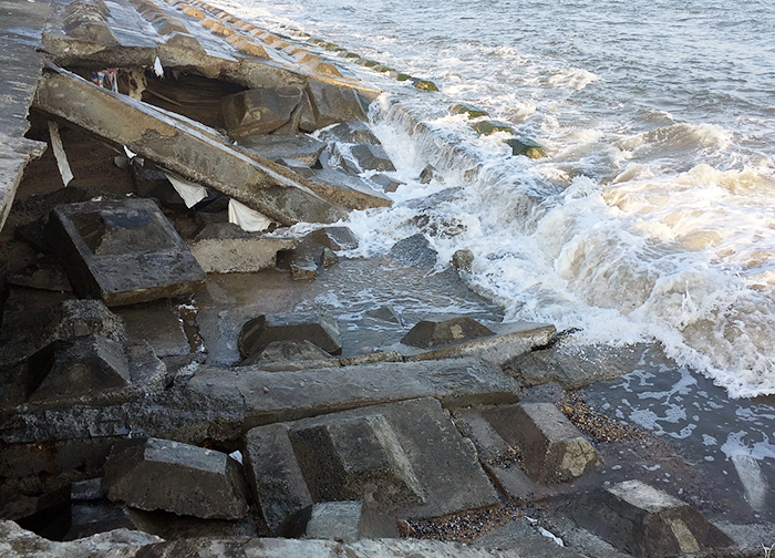 Một đoạn bờ kè cứng ở biển Cửa Đại, P.Cửa Đại, TP Hội An, Quảng Nam bị sóng biển đánh sụp lún hư hỏng nghiệm trọng.