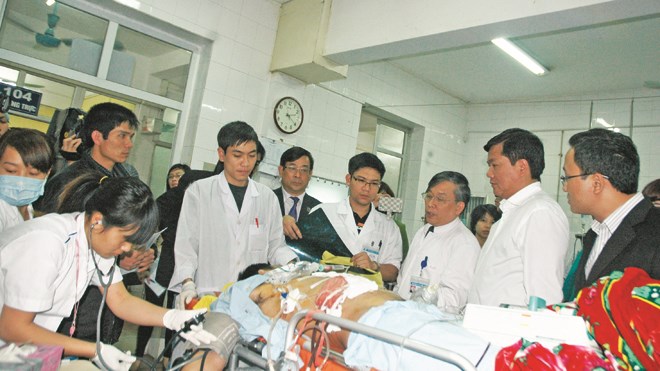 Bộ trưởng GTVT, Phó chủ tịch Ủy ban ATGT Quốc gia Đinh La Thăng thăm hỏi nạn nhân bị tai nạn giao thông tại Bệnh viện Việt Đức chiều mùng 4 Tết.