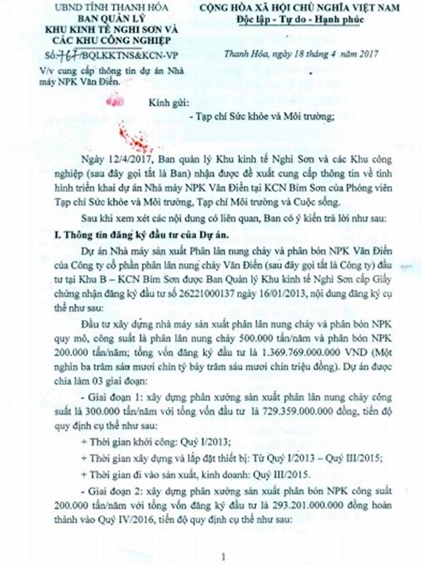 Để hiểu rõ hơn vấn đề, PV Sức khỏe & Môi trường đã có buổi làm việc với Ban quản lý KKT Nghi Sơn. Sau đó, ngày 18/4/2017 phía BQL đã có văn bản số 767 phản hồi báo.