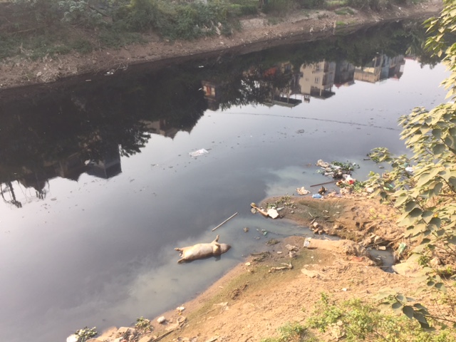 Xác động vật chết trương cộng với đủ thứ rác thải sinh hoạt được xả xuống sông.