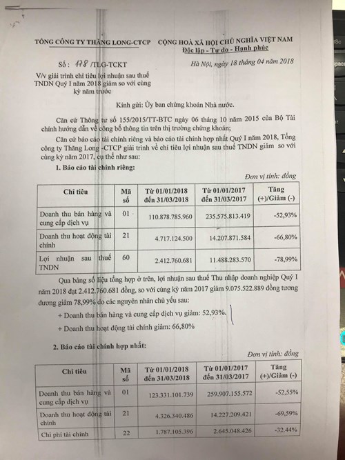 Tổng công ty Thăng Long-CTCP giải trình với Ủy ban chứng khoán Nhà nước về việc lợi nhuận sau thuế TNDN quý I năm 2018 giảm so với cùng kỳ năm trước.