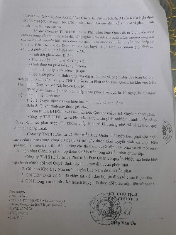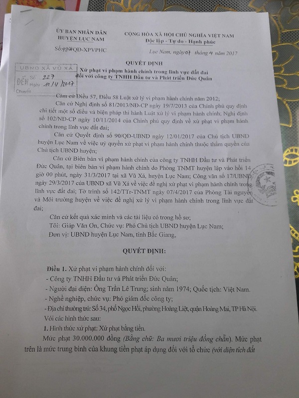 Quyết định xử phạt của Huyện Lục Nam.