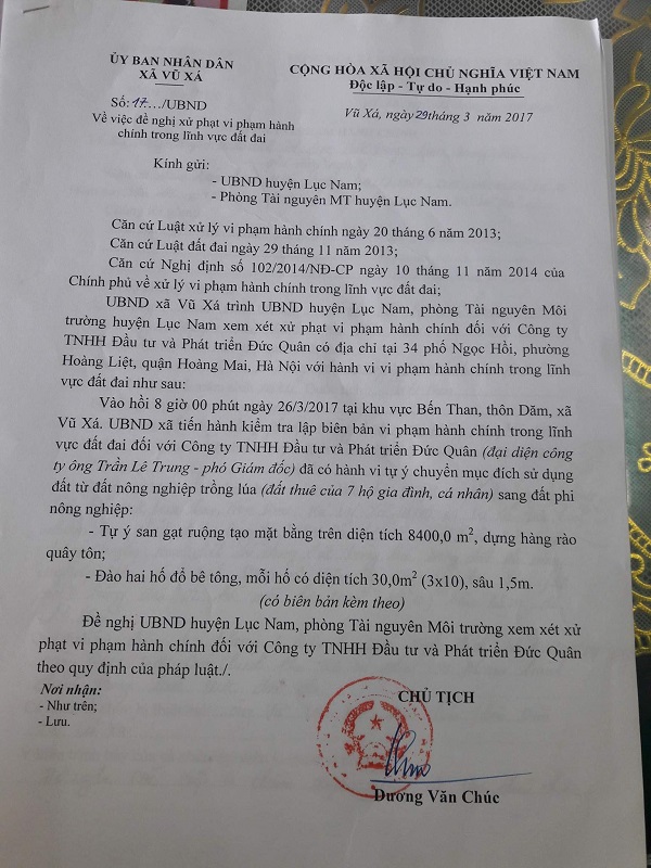 Quyết định xử phạt của xã Vũ Xá.