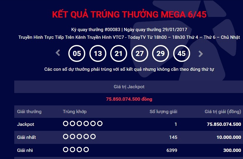 Theo thông tin của Công ty Xổ số điện toán Việt Nam - Vietlott, kỳ quay 83 vào chiều tối 29/1 (mồng 2 Tết) của chương trình xổ số tự chọn số Mega 6/45 đã tìm ra chủ nhân của giải Jackpot trị giá 75.850.074.500 đồng với chuỗi số của giải đặc biệt là 05-13-21-27-29-45.