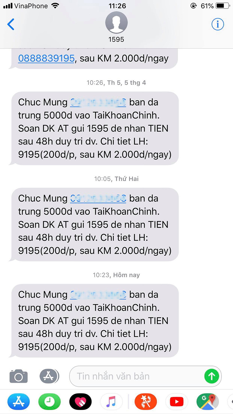 Cụ thể, nội dung tin nhắn thông báo: Chúc mừng 0912633xxx bạn đã trúng 5.000 đồng vào tài khoản chính. Soạn tin DK AT gửi 1595 để nhận tiền sau 48 giờ duy trì dịch vụ. Chi tiết liên hệ: 9195 (200 đồng/phút, sau khuyến mại 2.000 đồng/ngày.