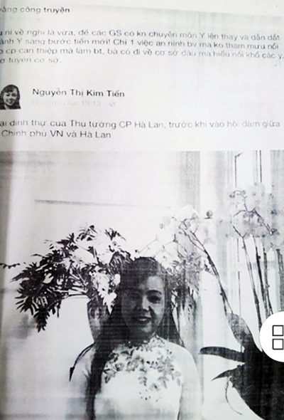 Trước đó, ngày 14/7/2017, trên trạng mạng xã hội facebook chủ tài khoản cá nhân “hoàng công truyện” được xác định của BS Hoàng Công Truyện đã dẫn lại facebook “Bộ trưởng Bộ Y Tế - Nguyễn Thị Kim Tiến” và đăng một dòng trạng thái “Mụ ni về nghỉ là vừa, để các giáo sư có khả năng chuyên môn Y lên thay và dẫn dắt ngành Y sang bước tiến mới! Chỉ 1 việc an ninh bệnh viện mà không tham mưu nổi cho Chính phủ can thiệp mà làm Bộ trưởng, bà có đi về cơ sở đâu mà hiểu nỗi khổ các y, bác sĩ ở tuyến cơ sở”