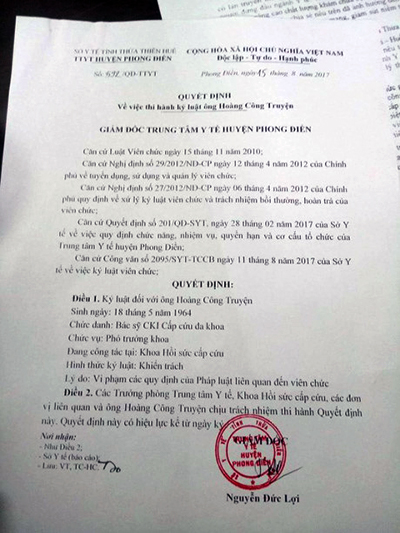 Bên cạnh đó, Trung tâm Y tế huyện Phong Điền đã họp kỷ luật khiển trách với BS Truyện ngày 15/9. Sở Y tế tỉnh Thừa Thiên - Huế đã đồng ý xử lý kỷ luật với hình thức như trên, lý do kỷ luật do vi phạm các quy định của pháp luật liên quan đến viên chức.