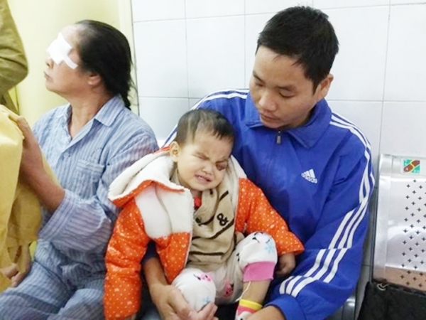 Cháu Thảo và bố lúc mới nhập viện, đôi mắt có khối u to lấn cả đôi mắt...